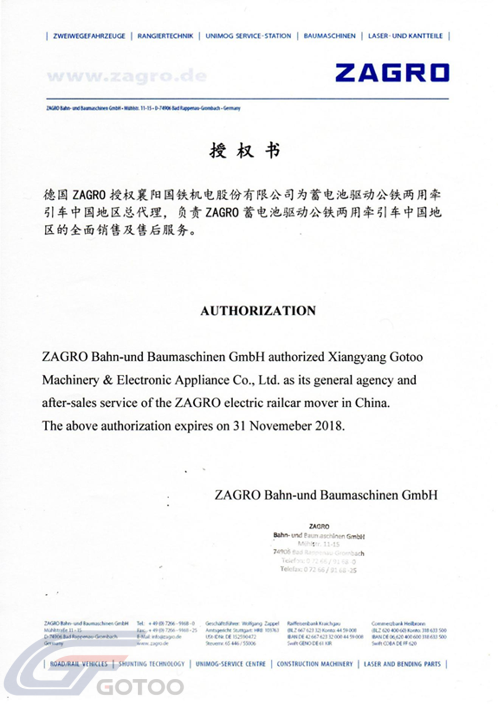 In November 2016, Gotoo and the world's most famous railcar mover manufacturer Zagro signed a cooperation agreement, becoming the China distributor of ZAGRO E-MAXI battery-driven railcar mover in China, and the only cooperative manufacturing base in Oversea.