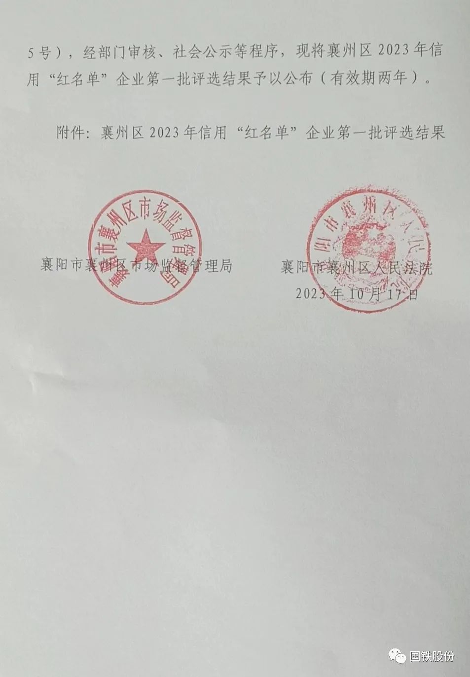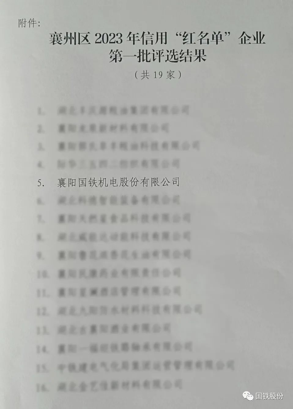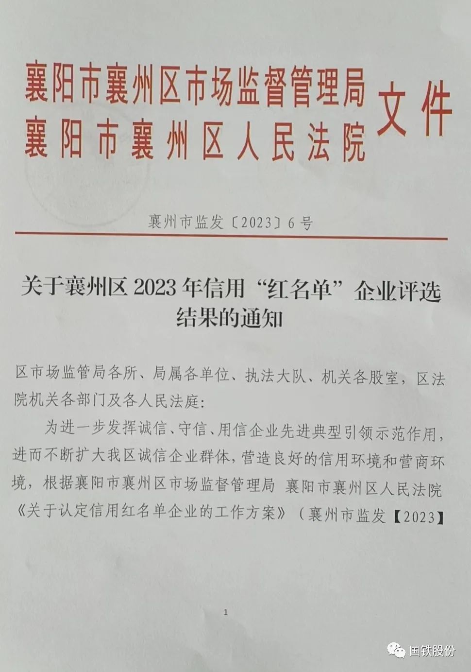 【喜報(bào)】國(guó)鐵機(jī)電獲“襄州區(qū)2023年信用‘紅名單’企業(yè)”榮譽(yù)