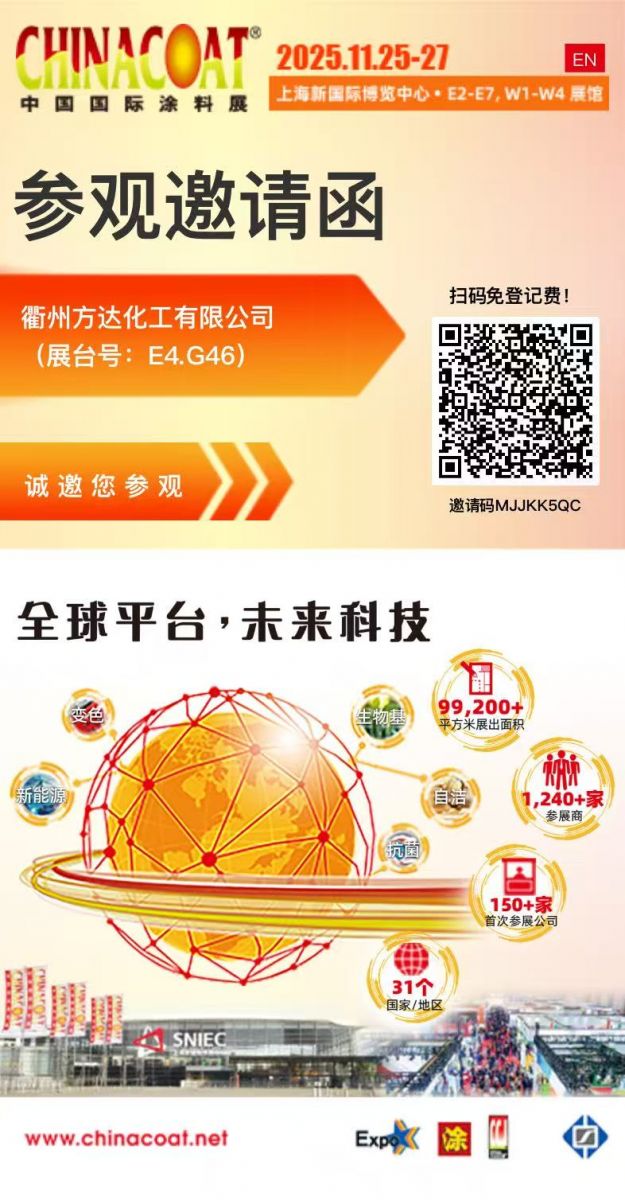 當(dāng)“碳達(dá)峰、碳中和”成為全球涂料行業(yè)的共同命題,一場關(guān)于綠色原料的“革命”正在悄然發(fā)生——衢州方達(dá)化工有限公司率先交出高分答卷!2025年11月25-27日,上海新國際博覽中心(SNIEC),方達(dá)化工將攜“專注新材料領(lǐng)域,用綠色原料編織低碳未來”的硬核實力,震撼亮相中國國際涂料展(CHINACOAT 2025)E4.G46展臺。